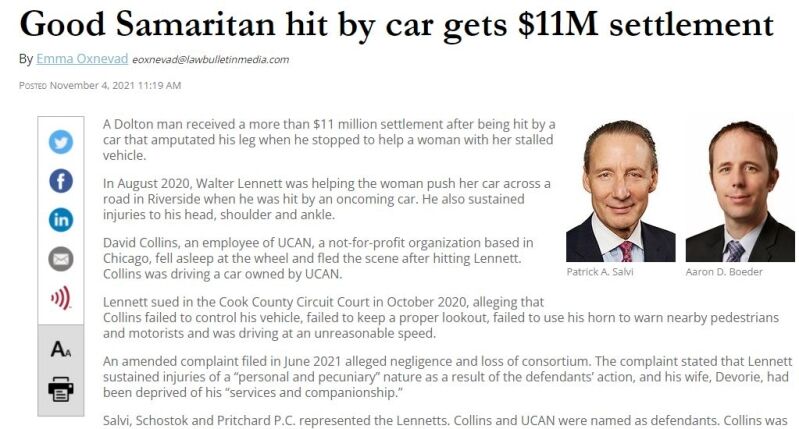 CHICAGO (November 4, 2021) – Attorneys Patrick Salvi, Aaron Boeder, Tara Devine, and Eirene Salvi recently obtained a more than $11 million settlement for a Dolton man who was hit by a car and lost his leg when he stopped to help a woman with her stalled vehicle.