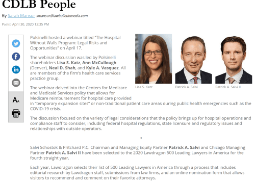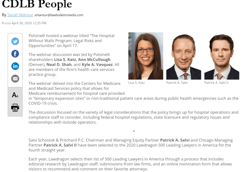 Home In the News Chicago Daily Law Bulletin: Pat Salvi, Pat Salvi II named to Lawdragon 500 Chicago Daily Law Bulletin: Pat Salvi, Pat Salvi II named to Lawdragon 500 On Apr 30th, 2020 by Marcie Mangan Firm News CHICAGO (April 30, 2020) – Patrick Salvi and Patrick Salvi II being named to the Lawdragon’s 500 Leading Lawyers in America was featured in the Chicago Daily Law Bulletin on Thursday, April 30. Share:
