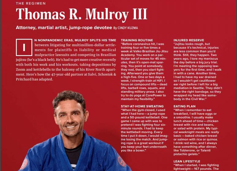 malpractice lawsuits and competing in Brazilian jujitsu (he’s a black belt). He’s had to get more creative recently with both his work and his workouts, taking depositions by Zoom and kettlebells to the balcony of his River North apartment.