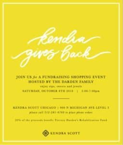 October 8, 2016 (CHICAGO) – Kendra Scott will host a Give Back Event at their Chicago store on Saturday, October 8, 2016 from 5 p.m. until 7 p.m. The company will donate 20 percent of proceeds from both in store and phone orders to Tierney Darden’s Rehabilitation Fund.