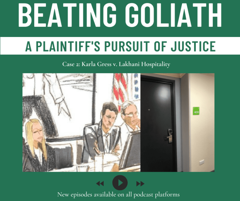 In the second season of Beating Goliath, Attorney Tara R. Devine and host Marcie Mangan share Karla’s harrowing story of survival and her lengthy pursuit of justice in civil court against the hotel that should have protected her and other guests from harm.