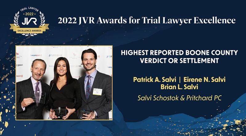 Attorneys Patrick A. Salvi, Brian L. Salvi, and Eirene N. Salvi were recognized for obtaining “the Highest Reported Boone County Verdict or Settlement” in Estate of Pedro Pasillas-Sanchez, deceased, Estate of Pedro Pasillas-Delgado, deceased v Consolidated Materials Inc. (Case No.: 18 L-15).