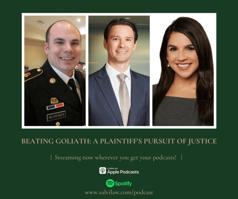 CHICAGO (August 17, 2021) – The lawyers of Salvi, Schostok & Pritchard P.C. are excited to announce the launch of the firm’s first podcast, “Beating Goliath: A Plaintiff’s Pursuit of Justice,” which shares a behind-the-scenes look at some of the firm’s biggest trials in history. In the first series of episodes, Attorney Patrick A. Salvi II and host Marcie Mangan share the incredible story of how Salvi, Schostok & Pritchard attorneys obtained a multi-million dollar recovery for an Iraq War Veteran who was seriously injured at Chicago’s McCormick Place Convention Center.